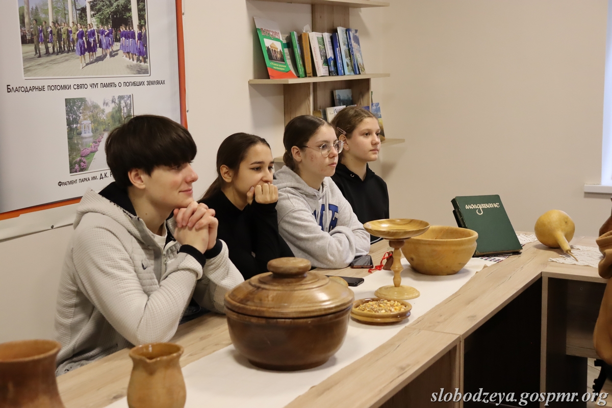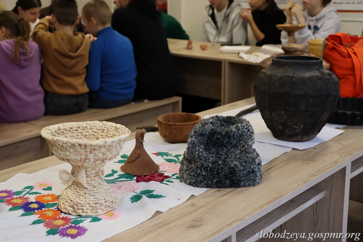 Вниманию гостей была представлена глиняная и деревянная посуда разных времен, в том числе макитра для перетирания мака для кутьи, сумка колядующих для гостинцев, зеркало для гаданий, кнут, книга уроженца с. Карагаш Я.С. Гросула «Молдаване», в которой описано множество традиций и обрядов молдавского народа, изделия мастеров-ремесленников Слободзейского района и другие экспонаты.