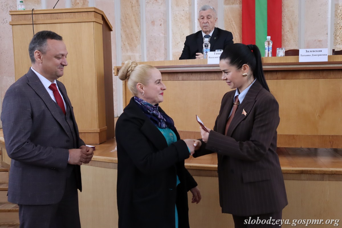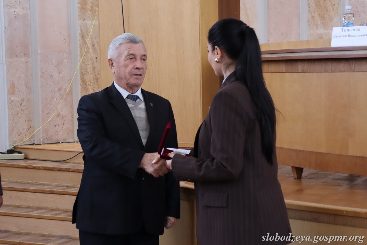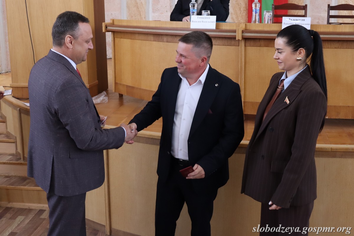 Татьяна Залевская также вручила нагрудный знак «35 лет Верховному Совету ПМР» главе госадминистрации Василию Тищенко, отметив, что «эта награда вручается выдающемуся государственному деятелю, который за свою жизнь не только был руководителем района, но и работал парламентарием во втором созыве». Она поблагодарила Василия Васильевича за преданность работе на благо района и республики. Нагрудный знак был вручен и Василию Морару, который также работал депутатом Верховного Совета, а сейчас занимает пост главы администрации с.Карагаш.