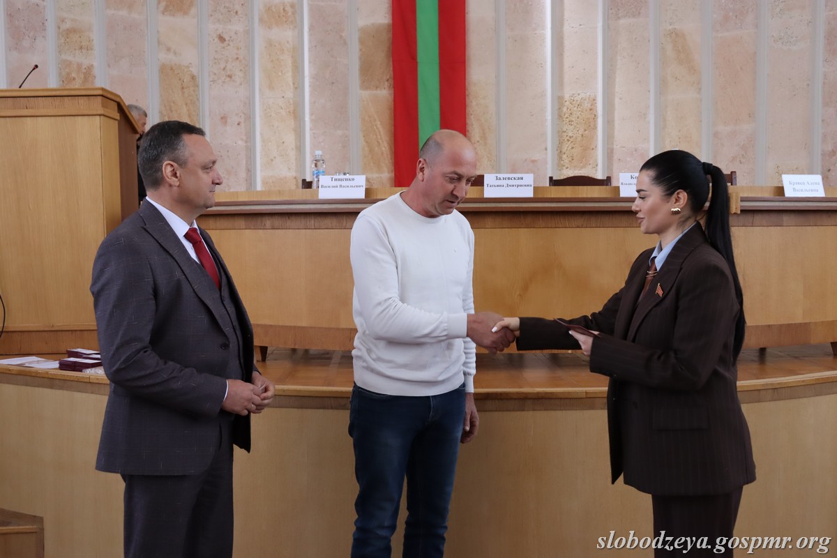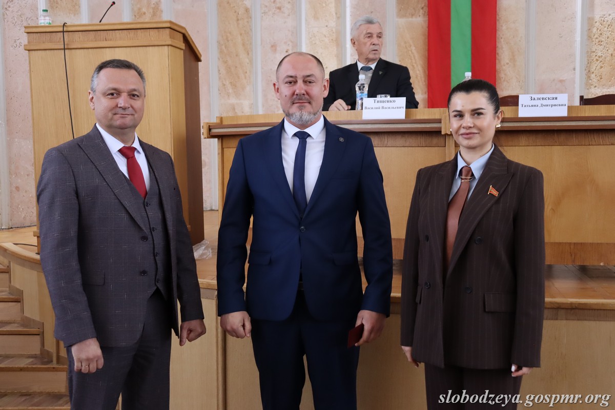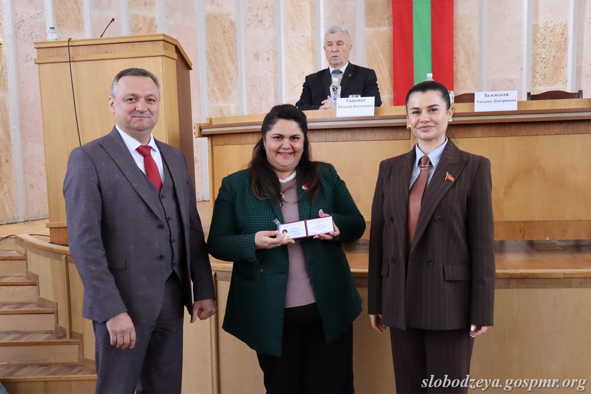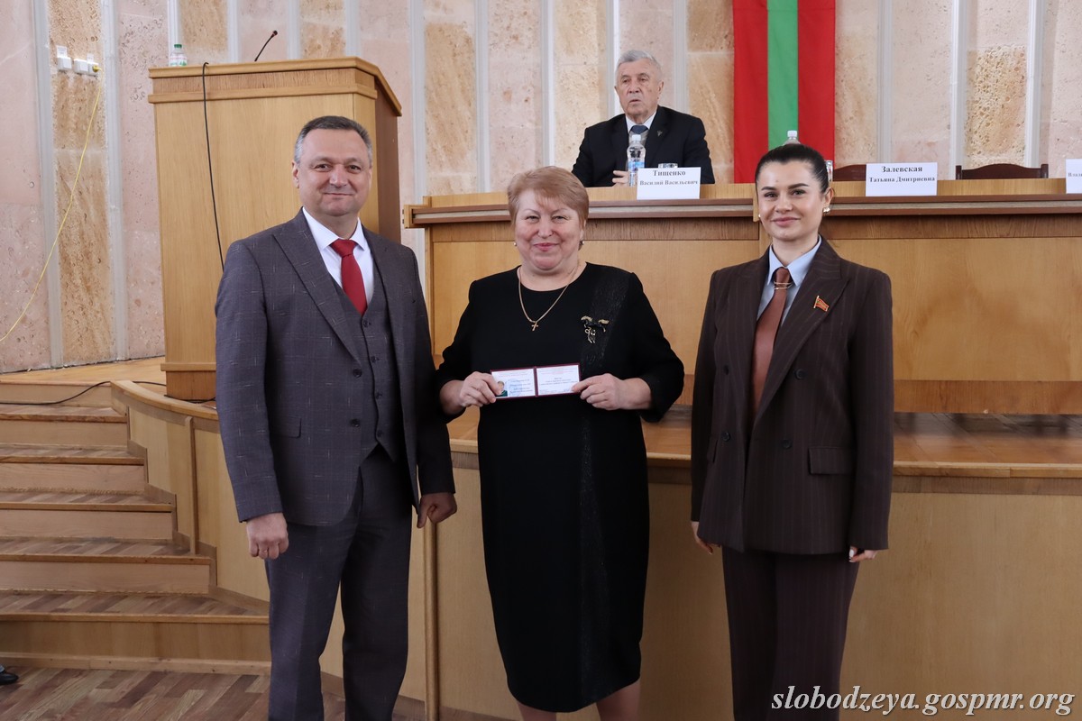 Татьяна Залевская также вручила нагрудный знак «35 лет Верховному Совету ПМР» главе госадминистрации Василию Тищенко, отметив, что «эта награда вручается выдающемуся государственному деятелю, который за свою жизнь не только был руководителем района, но и работал парламентарием во втором созыве». Она поблагодарила Василия Васильевича за преданность работе на благо района и республики. Нагрудный знак был вручен и Василию Морару, который также работал депутатом Верховного Совета, а сейчас занимает пост главы администрации с.Карагаш.
